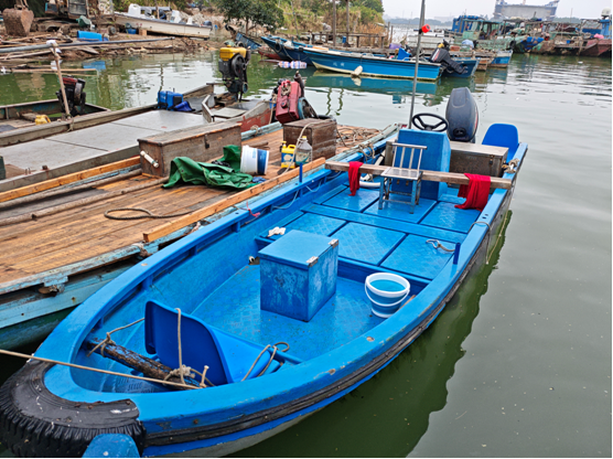 “涉嫌三无船舶2”:该船船体为蓝色玻璃钢材质,总长约6米;船艉挂有一黑色汽油机,功率未知。