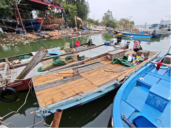 “涉嫌三无船舶5”:该船船体为绿色木质,总长约11米;艉与船头分别安装有一部汽油机,功率未知;船上保温箱,抄网等工具。