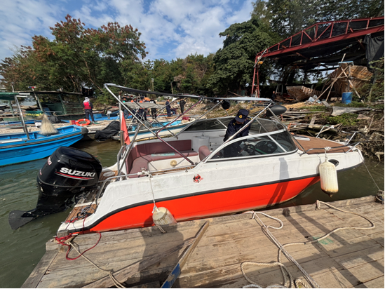“涉嫌三无船舶1”:该船船体为橙白色玻璃钢材质,总长约11米;船艉挂有一黑色汽油机;