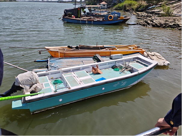该船艇船体为青白色玻璃钢材质,长约5米,船舷标有“佳运”,船艉有一黑色汽油发动机,功率未知。