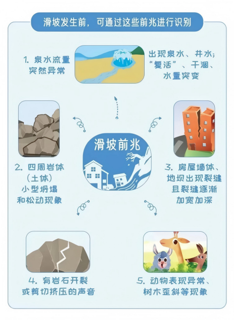 山体异常。山体出现很多白色水流,山坡变形、鼓包、裂缝,甚至坡上物体出现倾斜。