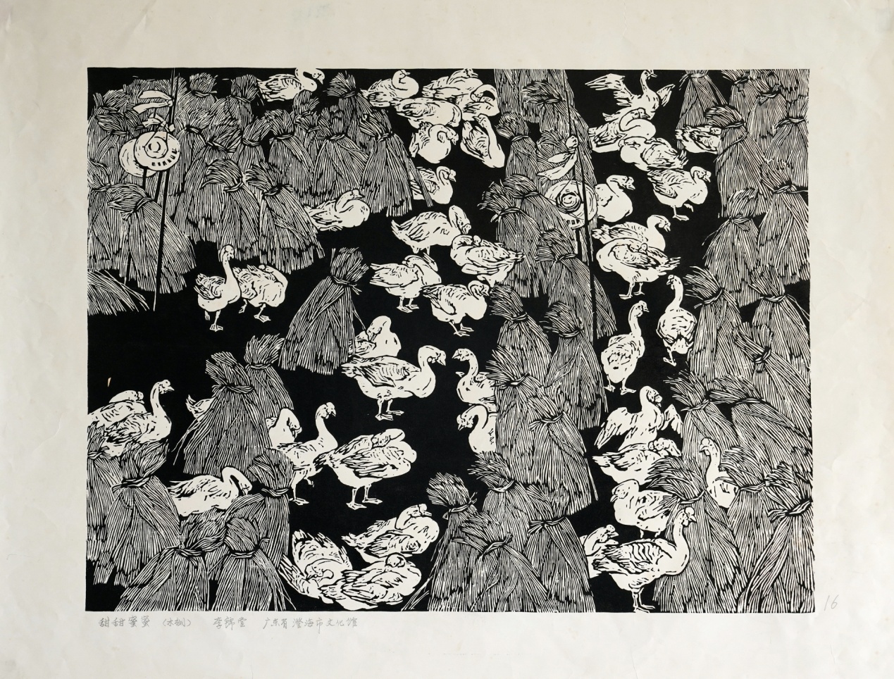 《甜甜蜜蜜》刻画休憩在稻草垛中的狮头鹅,安静闲适,姿态各异。画面之外的牧鹅人引人遐想。