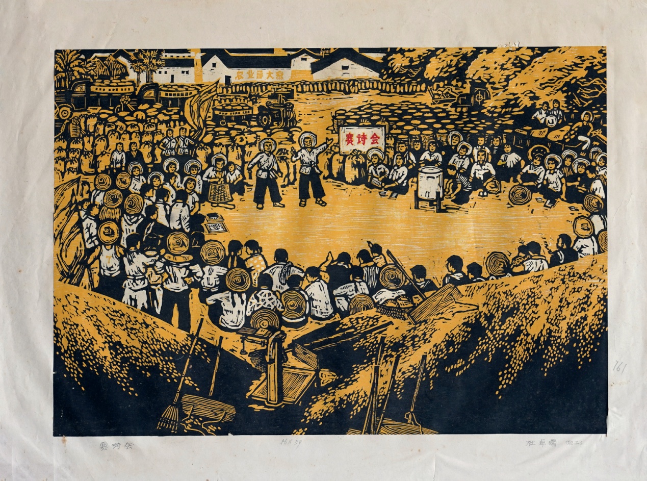 《一代诗风我们开》,原名《赛诗会》,作品灵感来自天津小靳庄农民诗会,结合本地实际进行艺术创作,套金黄色版表达农民庆丰收的喜悦。作品1976参加《高州、澄海农民版画展览》,并编入《高州、澄海农民版画选》。