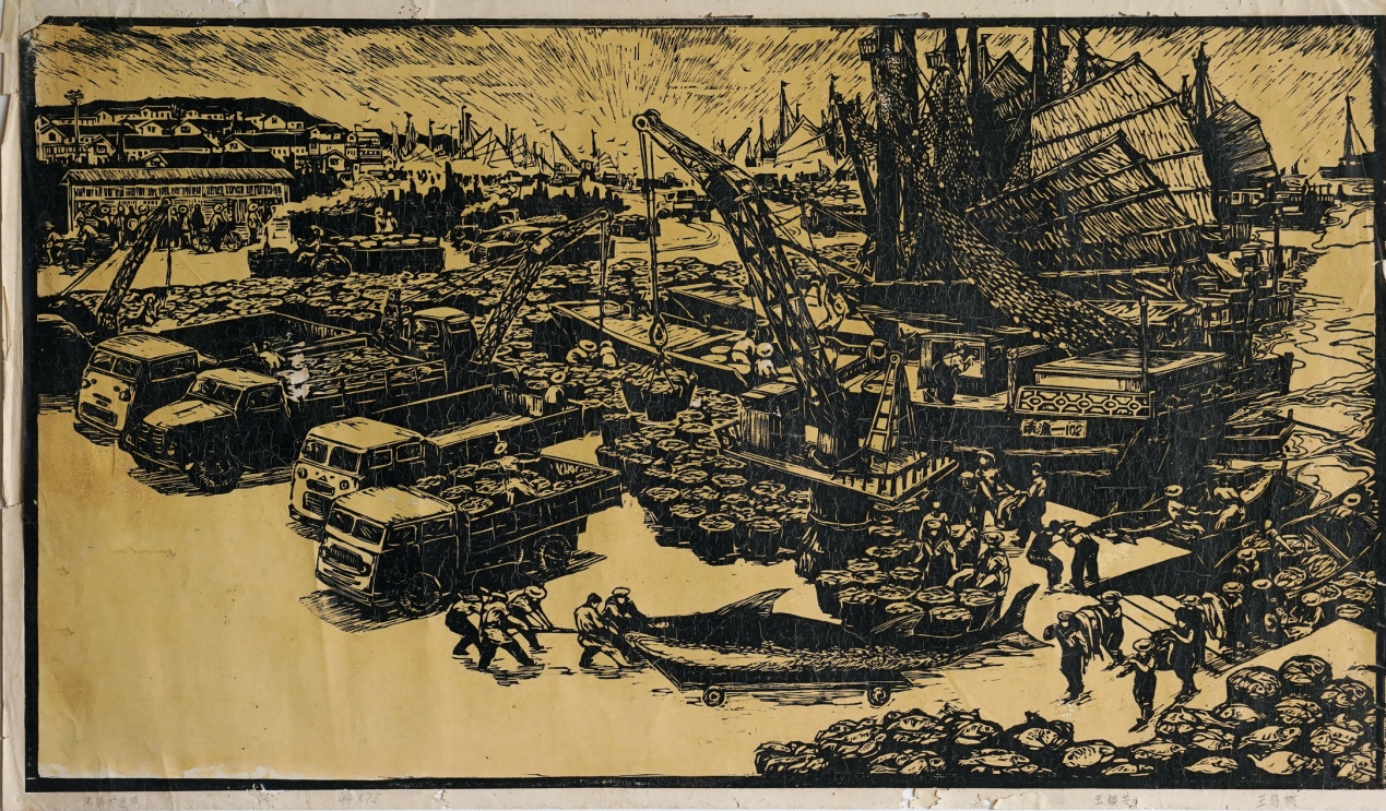 《沸腾的渔港》表现渔获归来的劳动场面,渔民、机帆船和大东风卡车,富于时代气息。