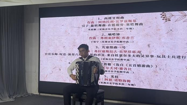 星海音乐学院本科及附中的手风琴专业学子们为现场观众带来了一场视听盛宴。莫祖桐、于恬宁、王张璀璨等三位年轻演奏者倾情演绎《西班牙组曲》、《嘀嗒钟》《儿童组曲一号》等经典曲目,指尖翻飞间,旋律或轻快灵动,或深沉婉转,赢得现场观众的热烈掌声。