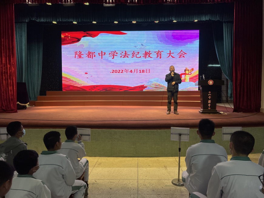 隆都中学一直重视对学生进行法纪教育和安全教育,多次邀请法治副校长到学校开设讲座,也经常要求教师将法纪教育、安全教育融入到课堂教学中,让学生牢固地树立起法纪意识,重视安全,提高自我保护能力,促进学生健康快乐成长。