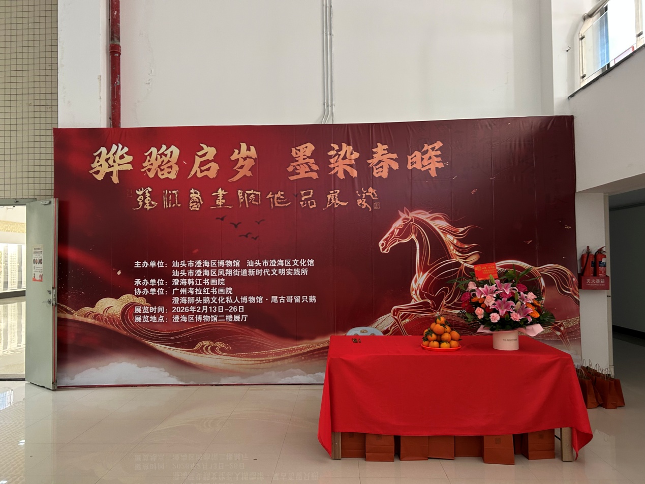 2026年2月17日至2月23日春节期间,汕头市澄海区博物馆开放时间为上午9:00-12:00,下午2:00-5:00。二楼临时展厅展出:骅骝启岁 墨染春晖——2026年澄海韩江书画院迎春作品展,欢迎广大市民朋友前来参观。